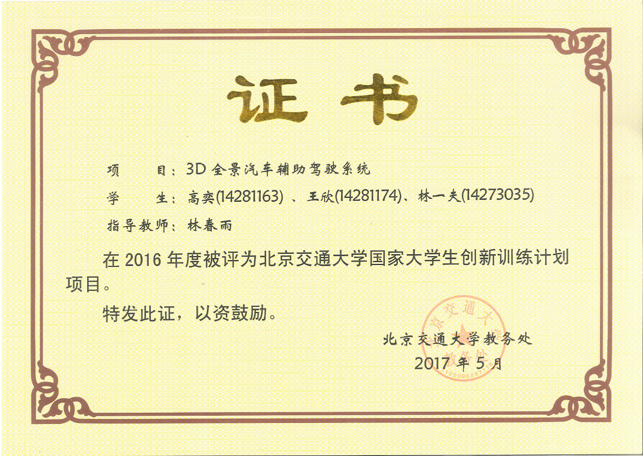 三、2016年指导《3D全景汽车辅助驾驶系统》