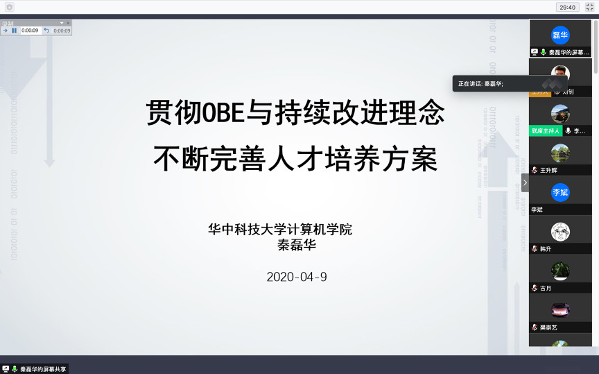 2020年4月9日,在疫情防控取得阶段性胜利,武汉顺利解禁之际,计算机学院邀请了华中科技大学计算机学院副院长秦磊华教授做了主题为“贯彻OBE与持续改进理念,不断完善人才培养方案”的在线报告,主要探讨了人才培养方案修订中的相关问题。计算机学院院长蔡伯根、副院长李清勇以及专业责任教授、教学主任、任课教师、教学管理人员共计50余人参加此次在线报告。
