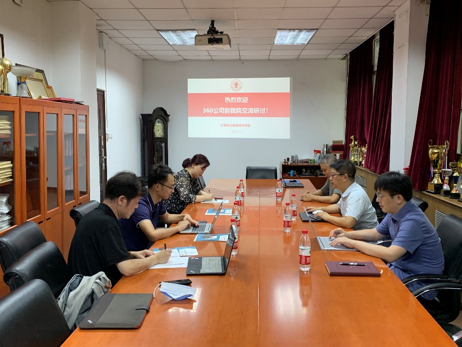 2021年7月7日下午,计算机学院在九教北111会议室召开了与360公司的产学合作交流研讨会。360公司教育事业部总经理李强等一行四人到访,会议由副院长熊轲主持,信息安全专业王健、李超等老师出席了此次研讨会。