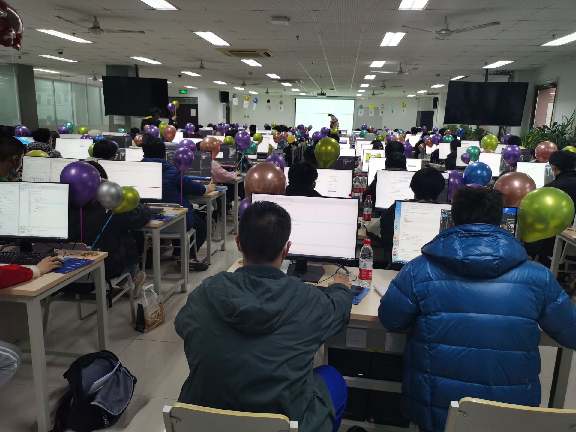 此次新生程序设计竞赛共有来自全校12学院的438名学生报名参加,蓝桥杯选拔赛有来自全校12个学院的186名同学报名参赛。鉴于报名参赛的人数已远远超出机房现场的容量,本次比赛在12月5日启用了网络预赛,经过代码查重等环节,根据机房容量确定了现场赛的参赛资格。本次赛事活动还邀请了北师、北理、地大及清华、哈工大等兄弟院校的部分同学以线上模式参赛。本次比赛开创了“一校三区”的办赛模式,同一份赛题、同一个排行榜单,在保障比赛公平、公正和安全的前提下,比赛在主校区、东校区和威海校区的机房同时开展。两项赛事、同一榜单、相同赛题、三个赛区,初生牛犊和经年老鸟在同一个平台上同台竞技、展示能力、切磋技艺。三个现场参赛的同学都只能访问同一个比赛服务器,查看同一个排行榜单,除此之外不能访问任何其他网络资源;参赛选手提交的所有代码均由机器依据数据自动进行评测,排除了人为因素,保障了赛事的公平公正。