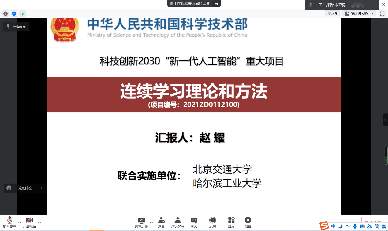 4月2日,科技创新2030—“新一代人工智能”重大项目2021年立项项目“连续学习理论和方法”项目启动暨实施方案论证会以线下线上相结合的形式召开,线下会场设在北京交通大学。科技部高技术中心、项目牵头单位北京交通大学领导,科技部项目专家组、项目顾问专家组,项目负责人、课题负责人、项目组骨干成员及专项办相关成员40余人参加了会议。