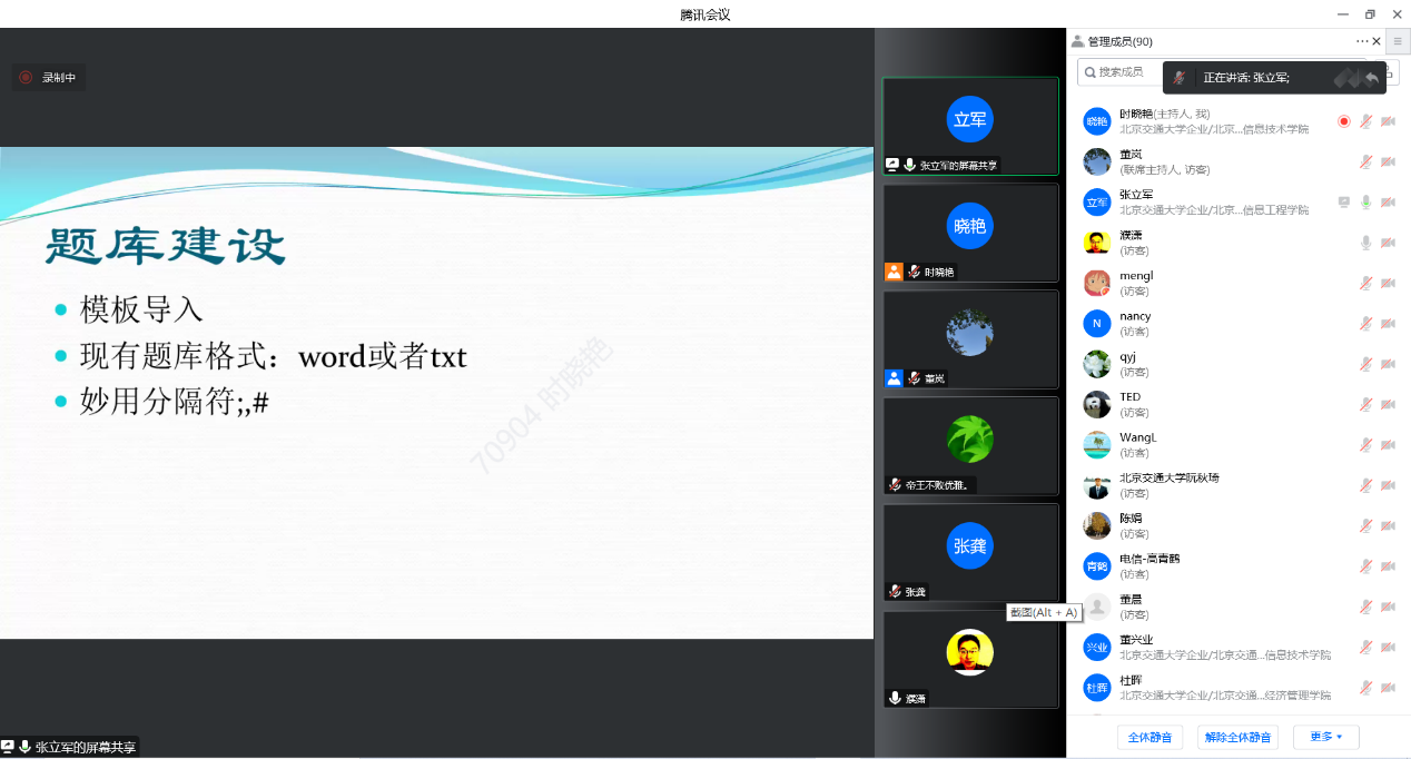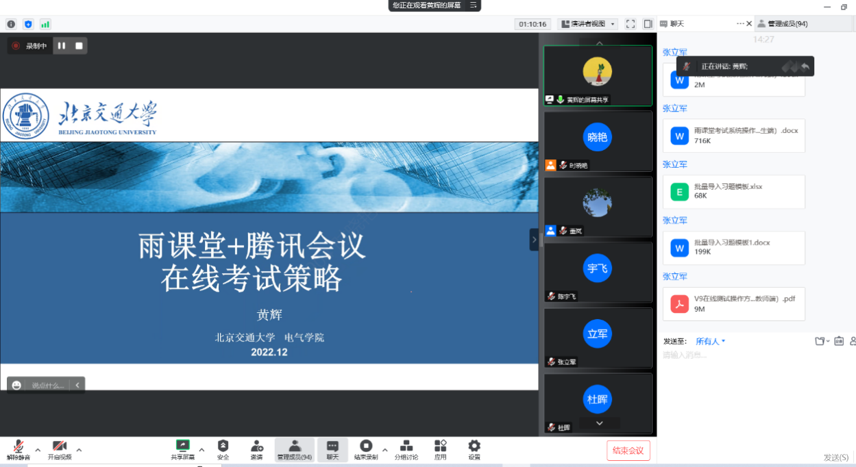本次会议邀请到了北京市教学名师、电气学院教授黄辉老师和校教师发展中心新媒体组骨干、电子与信息工程学院张立军老师,面向计算机学院全院老师通过腾讯会议做了期末线上考试培训与经验分享。两位老师分别就如何使用雨课堂、课程平台组织出题、监考、防止作弊等进行了详细介绍和分享。全校90多位老师参加了本次活动,参会老师们与两位报告专家在线上进行了热烈的交流和讨论。