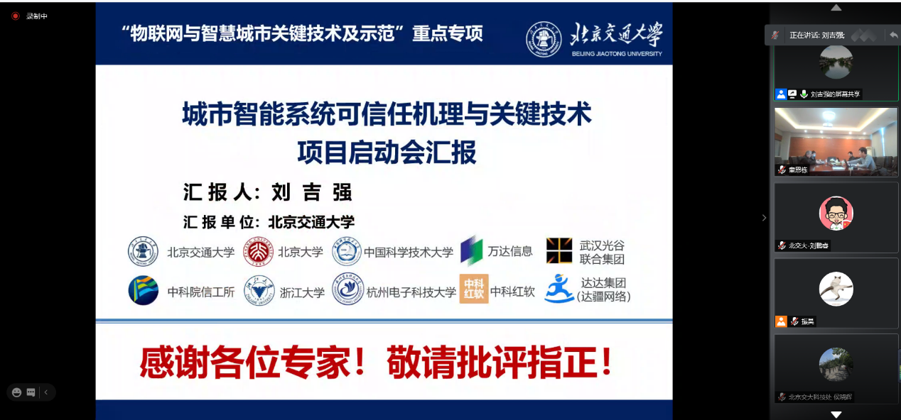 1月8日,由北京交通大学牵头,我院刘吉强教授承担的2020年国家重点研发计划“物联网与智慧城市关键技术及示范”重点专项项目“城市智能系统可信任机理与关键技术”项目启动会在线上成功召开。
